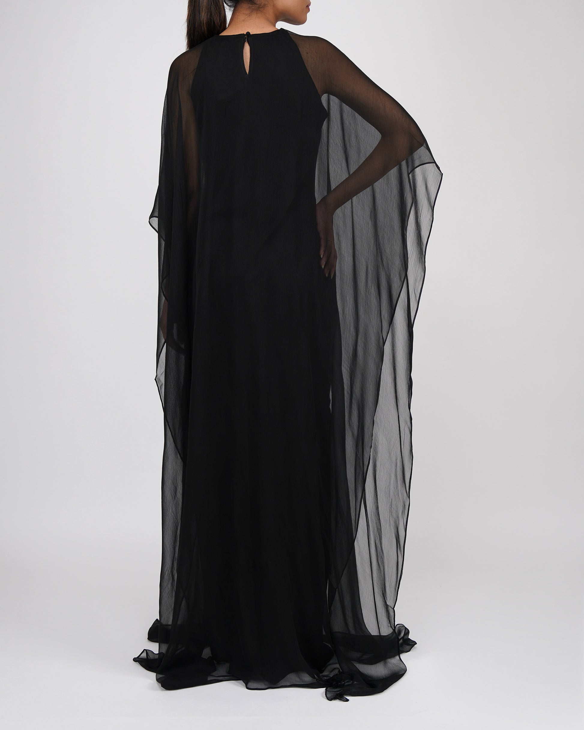 Two-piece dress with a slip and a cape in shades of black.