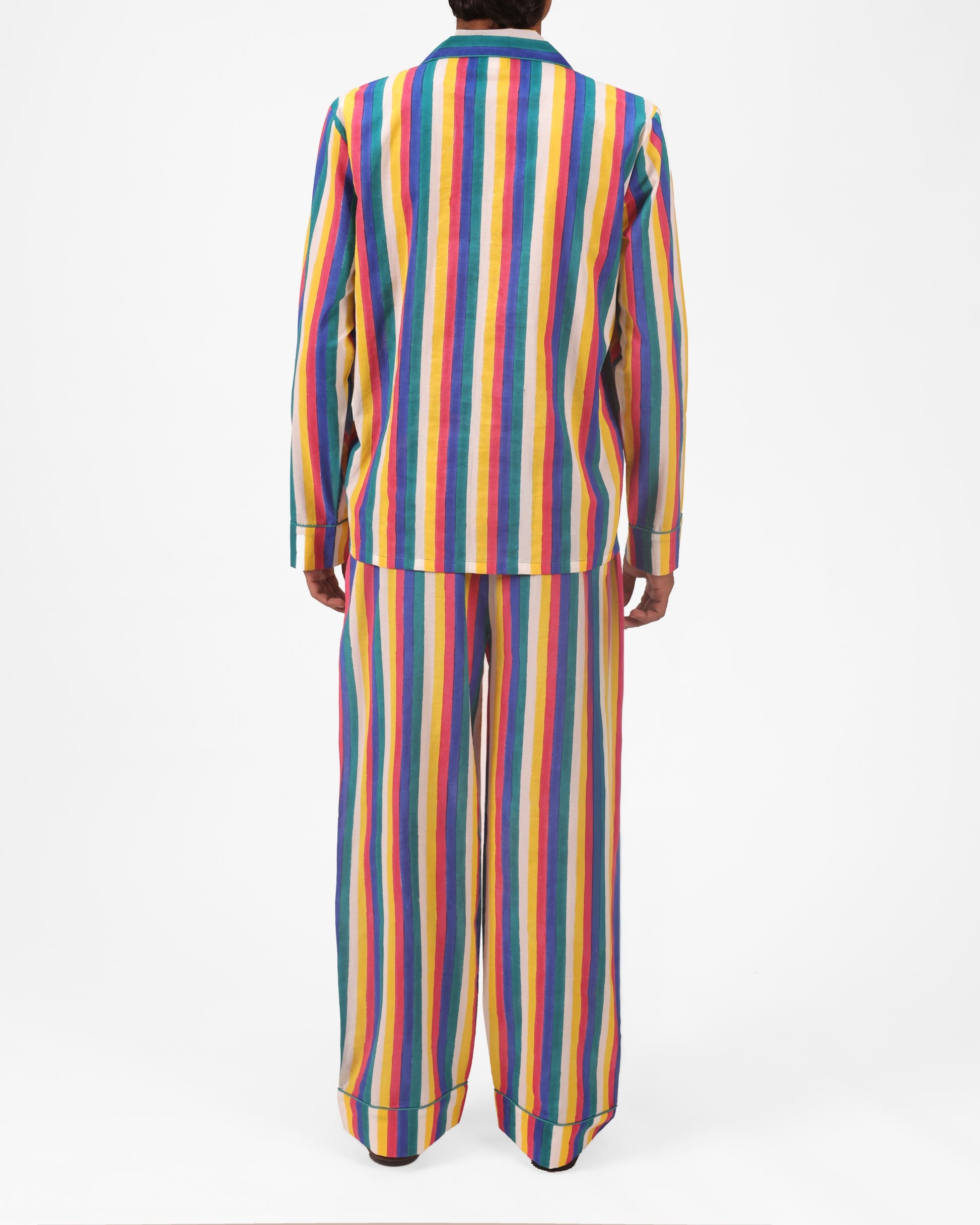 The cotton shirt and pants set featuring blockprinted stripes drawing inspiration from the five coloured flag of Jaipur. This shirt has full-sleeves, contrast colored green piping and a relaxed fit. The pants have an elasticated waistband with a drawstring fastening and a straight fit.