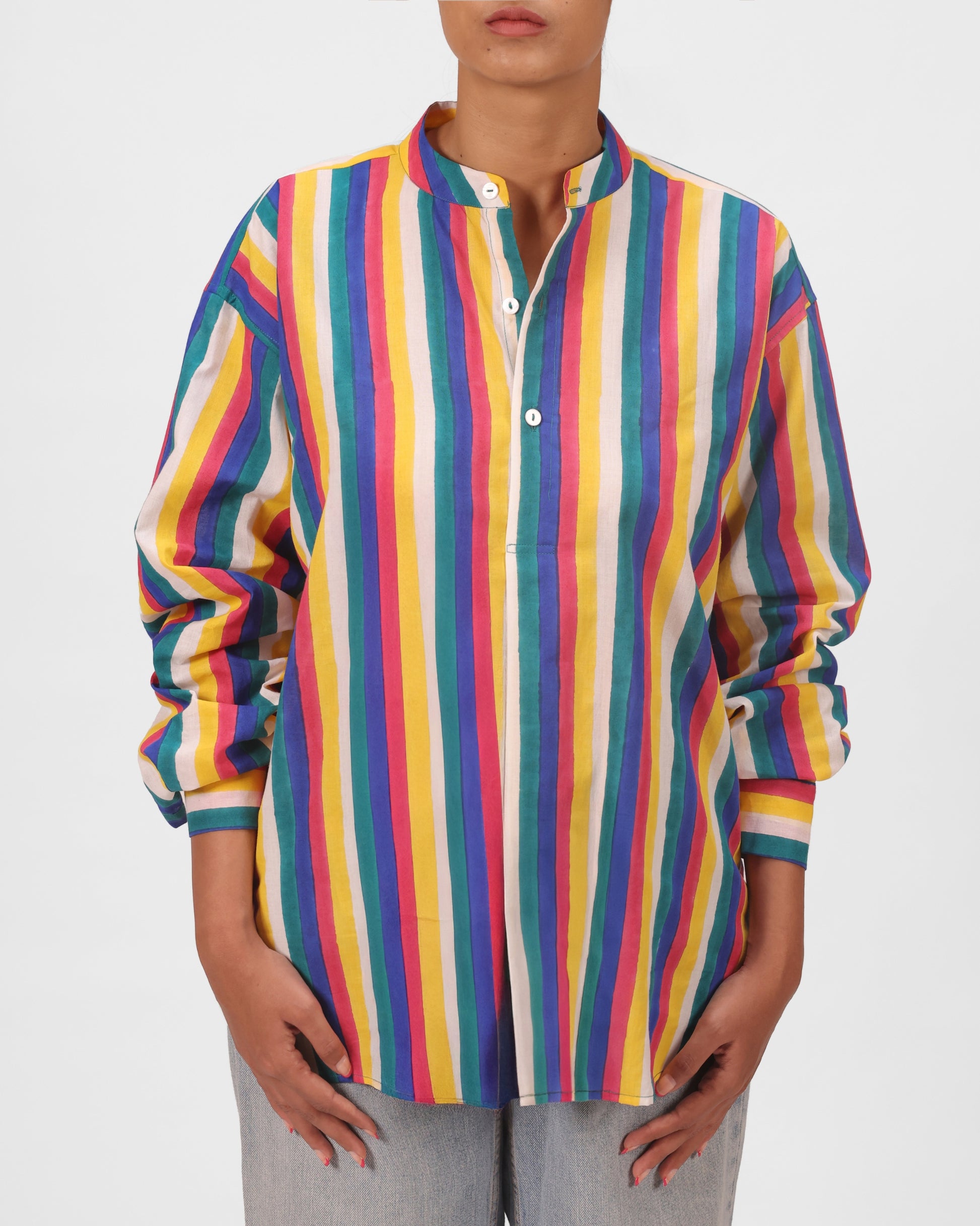 The Shirt features handblock printed stripes drawing inspiration from the five coloured flag of Jaipur. It has cuffed long sleeves and a mandarin collar. It has a relaxed fit and can be paired with denims or trousers.