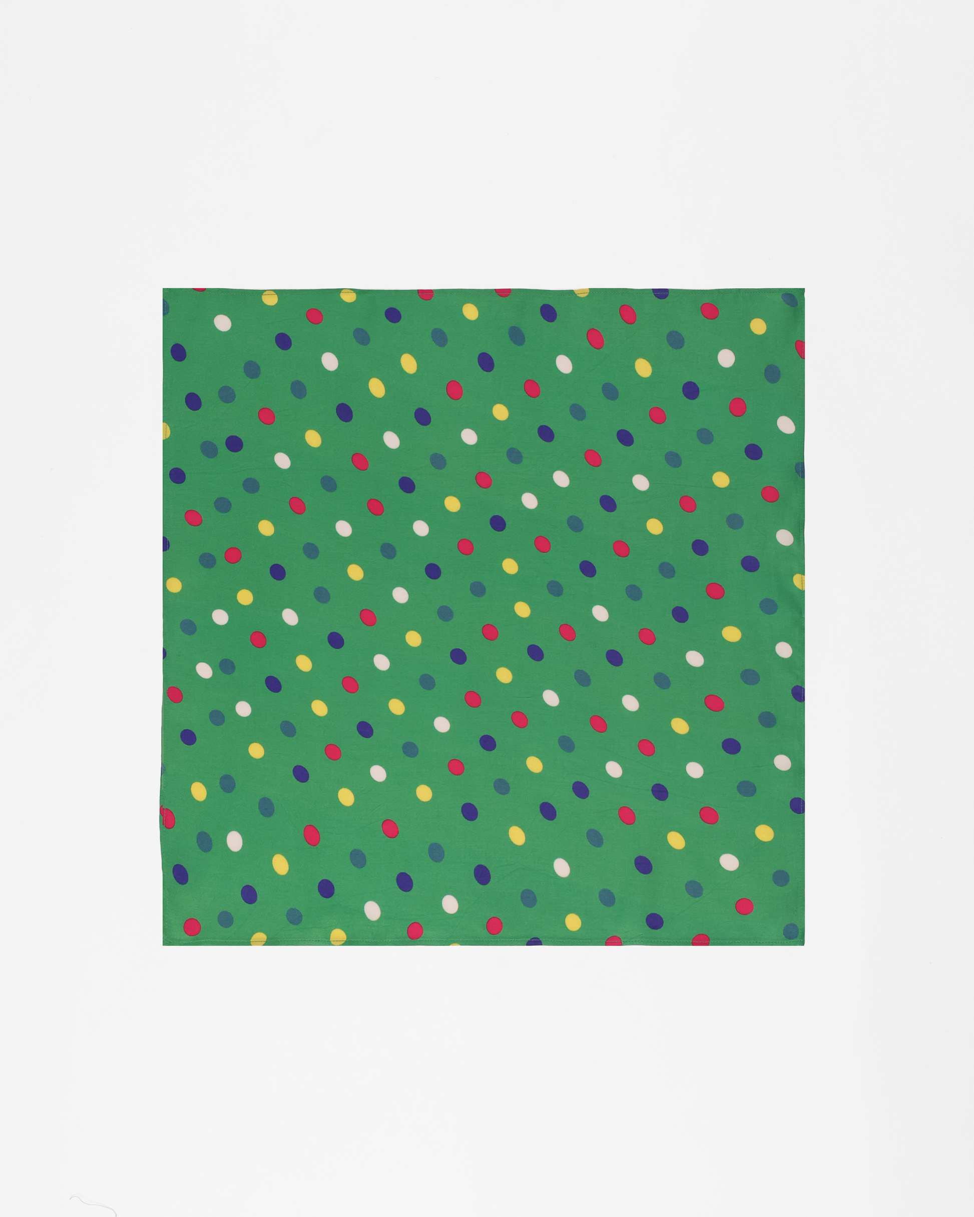 A satin Pocket Square featuring digitally printed polka dots drawing inspiration from the five coloured flag of Jaipur.