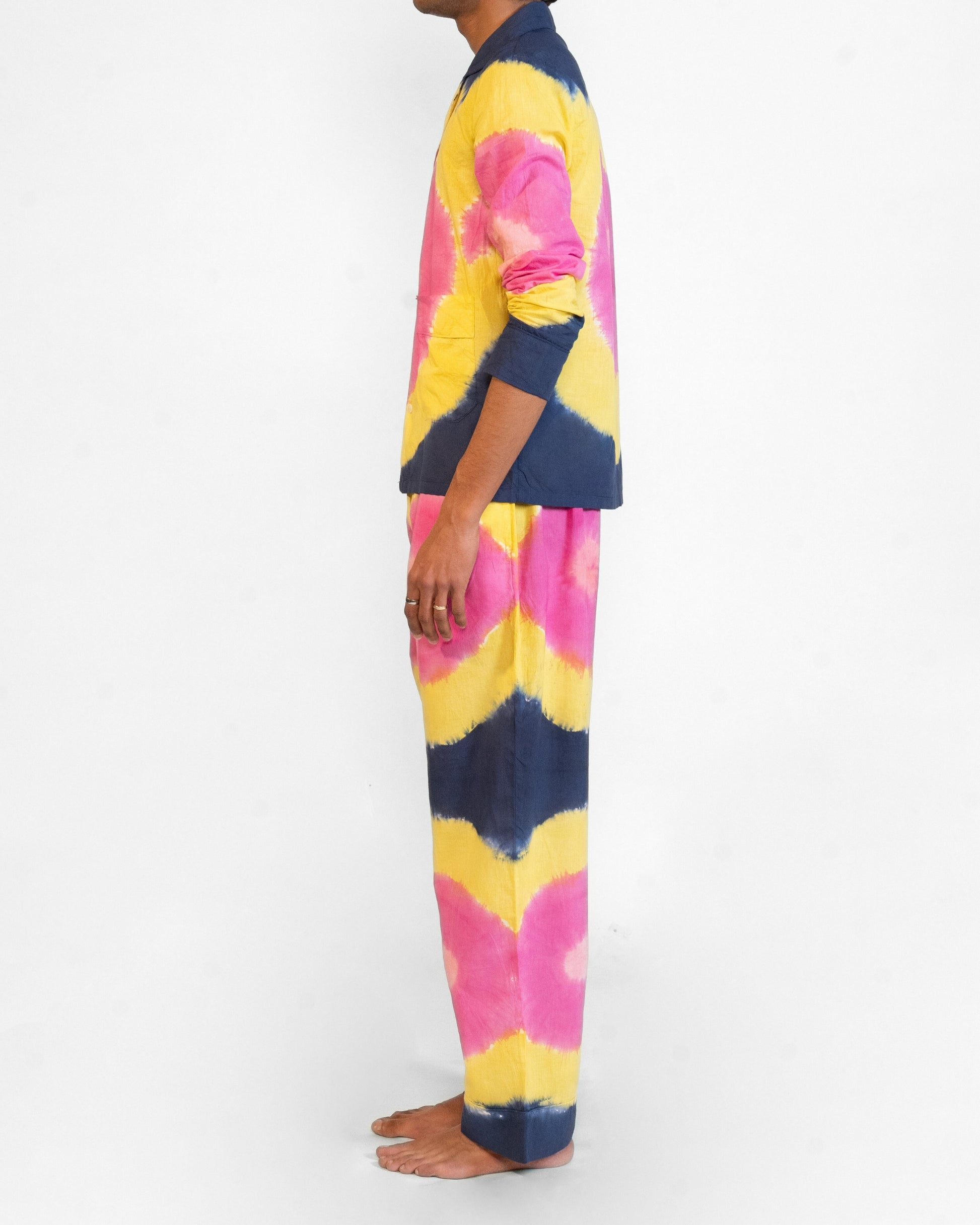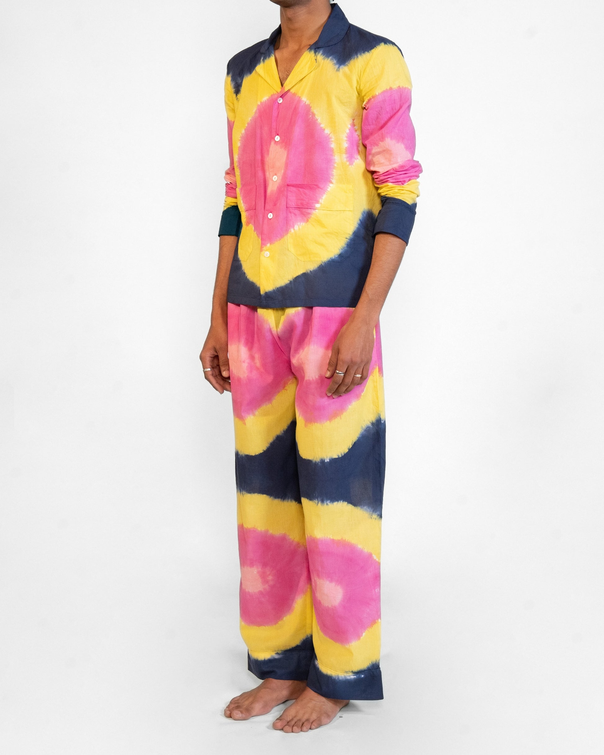 Two-piece shirt and pant set in multicolored shades.