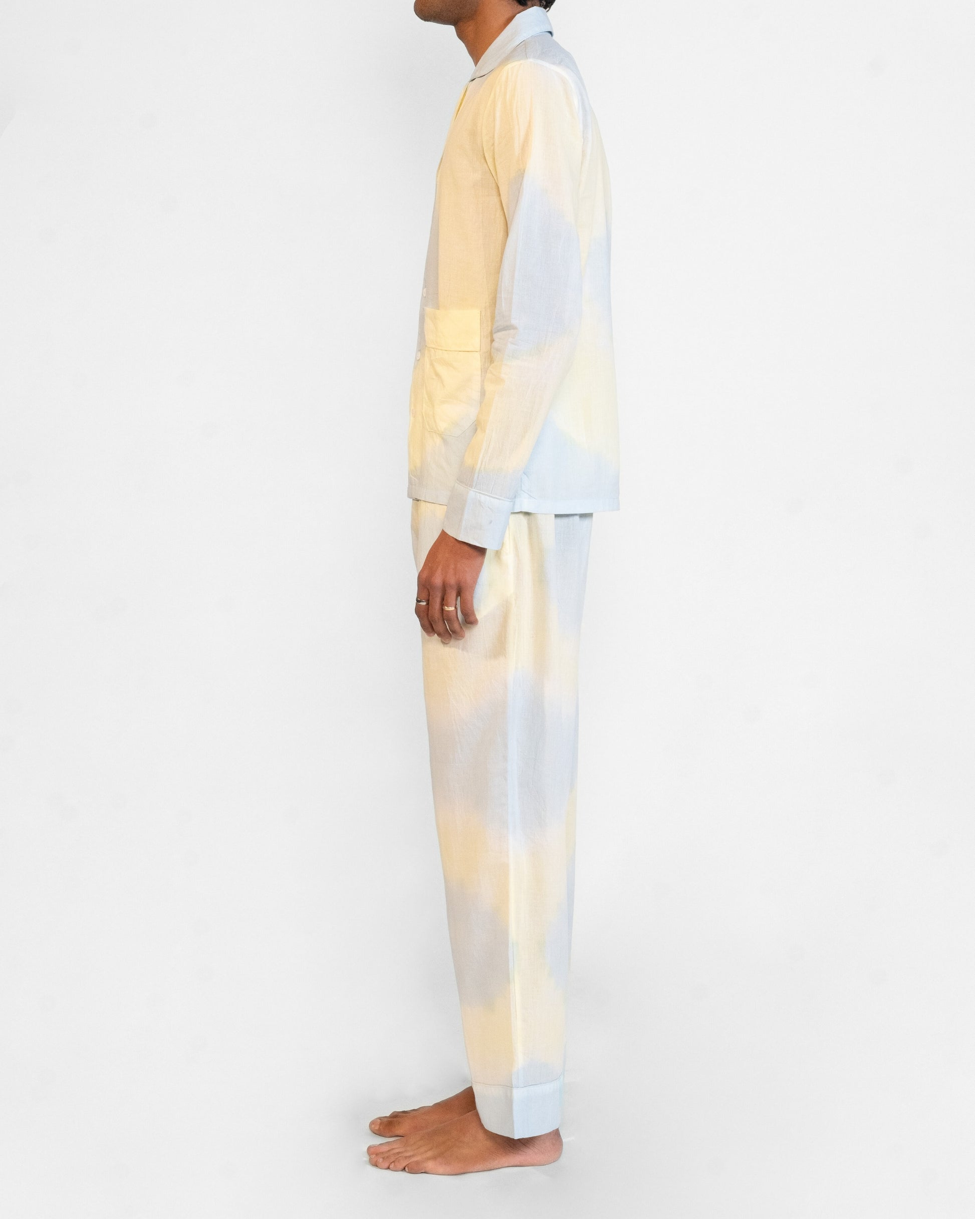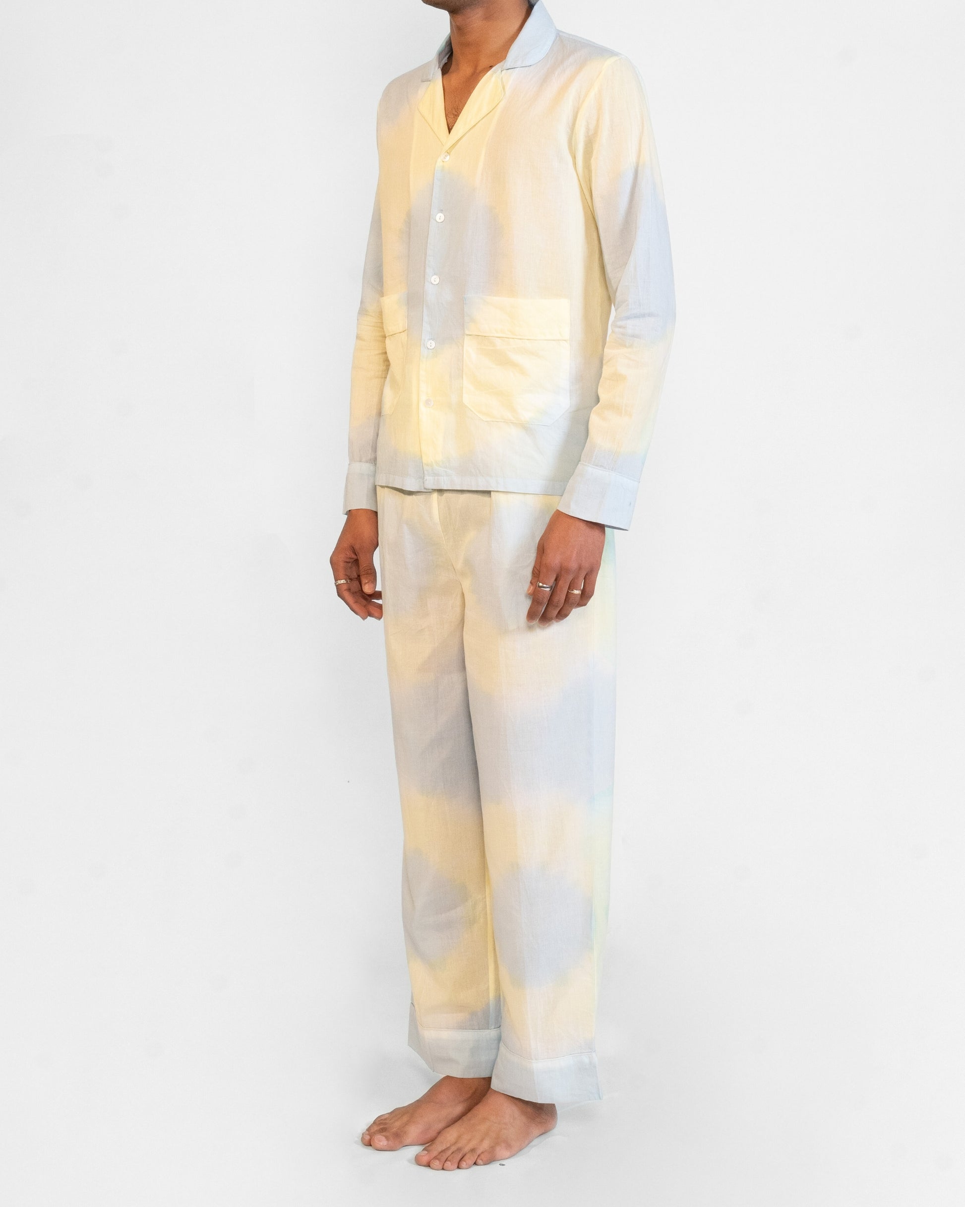 Two-piece shirt and pant set in shades of blue and yellow.
